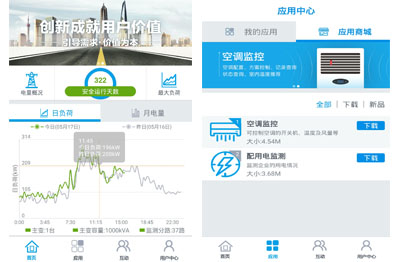 通過新聯(lián)電能云APP,用戶可以進(jìn)行信息查看、告警獲取、遠(yuǎn)程控制、功能插件下載以及論壇互動等。目前該平臺具備配用電監(jiān)測和空調(diào)監(jiān)控兩大功能插件: