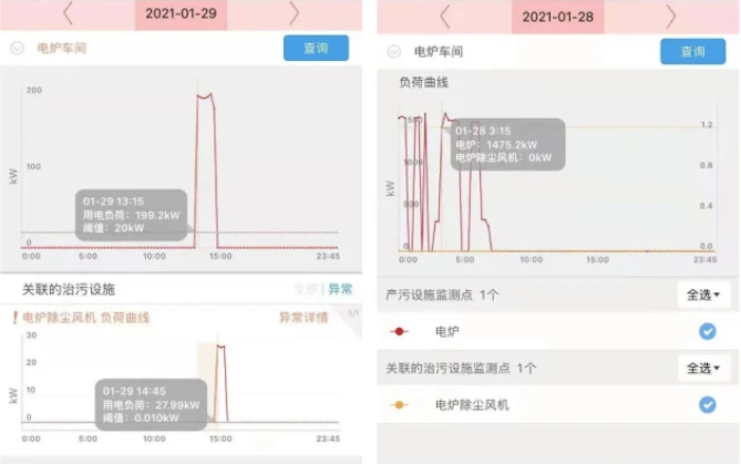 2021年1月29日,蘇州市用電工況監(jiān)控系統(tǒng)發(fā)出預(yù)警,顯示某有限公司廢氣治理設(shè)施用電量數(shù)天內(nèi)連續(xù)低值,疑似未與生產(chǎn)設(shè)施同步運行。根據(jù)預(yù)警線索,昆山市生態(tài)環(huán)境局執(zhí)法人員第一時間對該公司進(jìn)行了現(xiàn)場檢查。通過調(diào)取該企業(yè)1月27日-28日用電數(shù)據(jù),查實1月27日夜間至1月28日凌晨,該企業(yè)熔鐵電爐用電數(shù)據(jù)在1500kW以上,但配套的布袋除塵風(fēng)機沒有用電數(shù)據(jù)。昆山市生態(tài)環(huán)境局對該公司未采取集中收集處理等措施控制、減少粉塵和氣態(tài)污染物排放的環(huán)境違法行為予以立案處罰。
