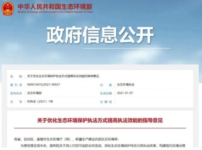2021年1月,生態(tài)環(huán)境部印發(fā)《關(guān)于優(yōu)化生態(tài)環(huán)境保護(hù)執(zhí)法方式提高執(zhí)法效能的指導(dǎo)意見》,將其作為引導(dǎo)生態(tài)環(huán)境執(zhí)法工作、推動執(zhí)法制度機制創(chuàng)新的重要指南,指導(dǎo)各地進(jìn)一步明確執(zhí)法責(zé)任、優(yōu)化執(zhí)法方式、完善執(zhí)法機制、規(guī)范執(zhí)法工作,切實提高執(zhí)法效能。