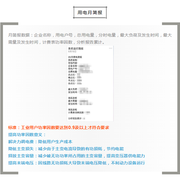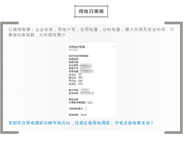 默認推送的數(shù)據(jù)項:企業(yè)名稱、用電戶號、分析報告累計、最大負荷及發(fā)生時間、最大需量及發(fā)生時間(月報)、計費表功率因數(shù)、總用電量、分時電量